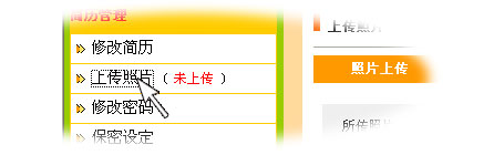注冊成功后系統(tǒng)會(huì)自動(dòng)跳轉(zhuǎn)到個(gè)人管理頁面,點(diǎn)擊“上傳照片”,上傳不大于100KB的照片,這樣更容易讓招聘企業(yè)青睞; |